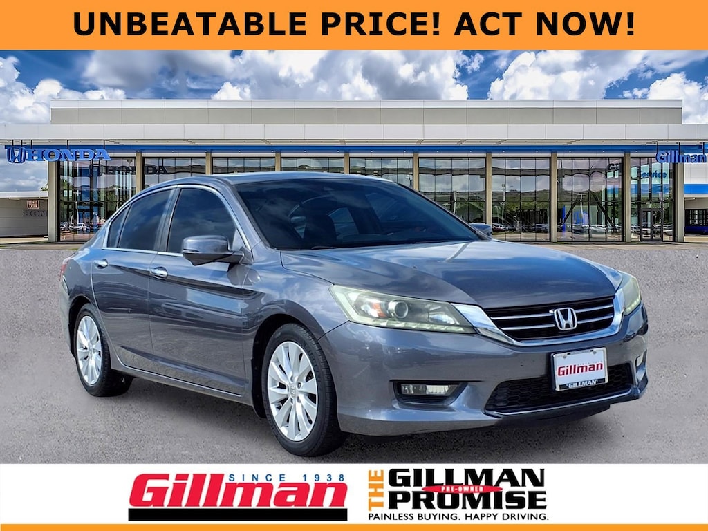 Gillman's Lifetime Engine Warranty lasts as long as you own your vehicle - free with the Gillman Pre-Owned Promise. If the vehicle isn't right for you, return it in purchase condition within 2 days or 200 miles as part of our Happy-Driving Guarantee. (Valid on vehicles under 90,000 miles and less than 7 years old). Experience the perfect blend of power and luxury with this DK. GRAY 2014 Honda Accord EX-L V6 Sedan. Its robust 3.5L V6 engine delivers 278hp for a spirited drive, paired with a smooth 6-speed shiftable automatic transmission and front-wheel drive. Enjoy premium features like leather upholstery, heated front seats, and a power moonroof for added comfort. Stay connected and entertained with the 7-inch touchscreen infotainment system, Bluetooth, SiriusXM, Pandora, HondaLink, and a 360-watt audio system with subwoofer. Advanced safety highlights include a rearview camera, blind spot camera display, lane deviation sensors, and a suite of airbags. Convenience is at your fingertips with proximity entry, push-button start, driver memory settings, and multi-function steering wheel controls. Alloy wheels, chrome trim, and sleek styling complete the package. This Accord is the perfect sedan for those seeking reliability, performance, and upscale amenities. All vehicles subject to prior sale. We are not responsible for typographical errors and may change information without notice. Photos may not depict the actual vehicle. Tax, title, and license fees not included. Dealer Discount available to all buyers.Vehicles purchased from Gillman Automotive Group include a Bring It Back Guarantee: return the vehicle in purchase condition within two days or 200 miles. New current-model-year vehicles and qualifying pre-owned vehicles (under 90,000 miles and less than 7 years old) are eligible. Guarantee is non-transferable and has no cash value. Lifetime Warranty available on select pre-owned vehicles. See dealer for details; restrictions may apply.