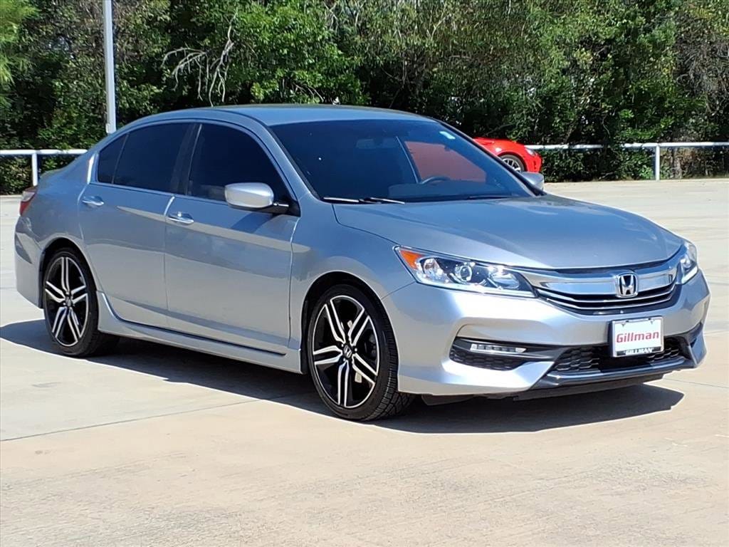 Experience sporty sophistication with this Silver 2017 Honda Accord Sport Special Edition Sedan. Powered by a responsive 2.4L I4 engine paired with a 7-speed shiftable CVT, this Accord delivers a smooth, efficient ride and excellent fuel economy. Enjoy premium touches like leather-trimmed upholstery with contrast stitching, heated front seats, a leather-wrapped steering wheel and shift knob, and aluminum alloy wheels. Stay connected with the 7-inch infotainment screen, Bluetooth wireless data link, Pandora internet radio app, and multi-function steering wheel controls. Safety features include a multi-view rear camera, LED daytime running lights, LED front fog lights, electronic brakeforce distribution, and a full suite of airbags. The decklid rear spoiler, chrome window trim, and body-color bumpers add a sporty edge, while automatic climate control and power-adjustable driver seat ensure comfort on every drive. With Honda's reputation for reliability and a striking appearance, this Accord Sport Special Edition is ready for your next adventure.