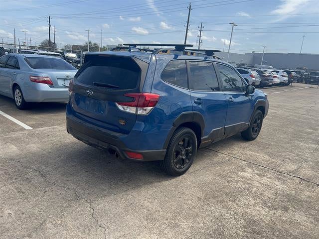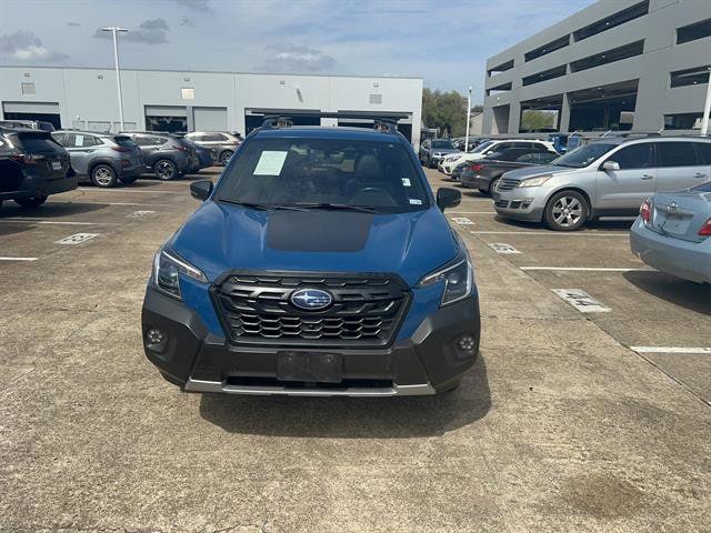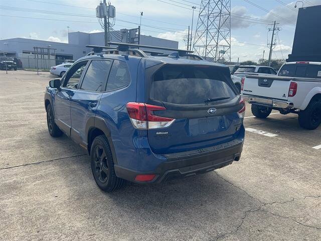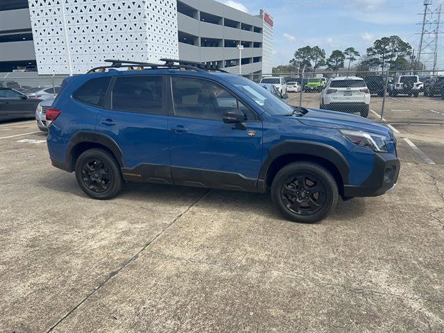 Experience adventure-ready capability with this Blue 2022 Subaru Forester Wilderness AWD Crossover. Designed for off-road enthusiasts and daily drivers alike, the Wilderness trim offers enhanced ground clearance, rugged front and rear underguards, and black roof rails for all your gear. Stay connected and entertained with an 8-inch STARLINK infotainment screen featuring Apple CarPlay, Android Auto, and SiriusXM. Safety comes standard with Subaru's EyeSight suite: adaptive cruise control, lane centering, lane keeping assist, front and rear automatic emergency braking, and blind spot monitoring with rear cross traffic alert. Inside, enjoy heated seats, a power panoramic moonroof, easy-clean rubber/vinyl cargo mat, and leatherette accents with contrast stitching. Convenience features include push-button start, power rear gate, and multiple USB ports. Powered by a 2.5L 182hp engine paired with an 8-speed shiftable CVT, this Forester delivers confidence on any terrain with Subaru's legendary Symmetrical AWD and hill descent control. Take on your next journey in comfort, safety, and style-discover why the Forester Wilderness is a top choice for explorers.